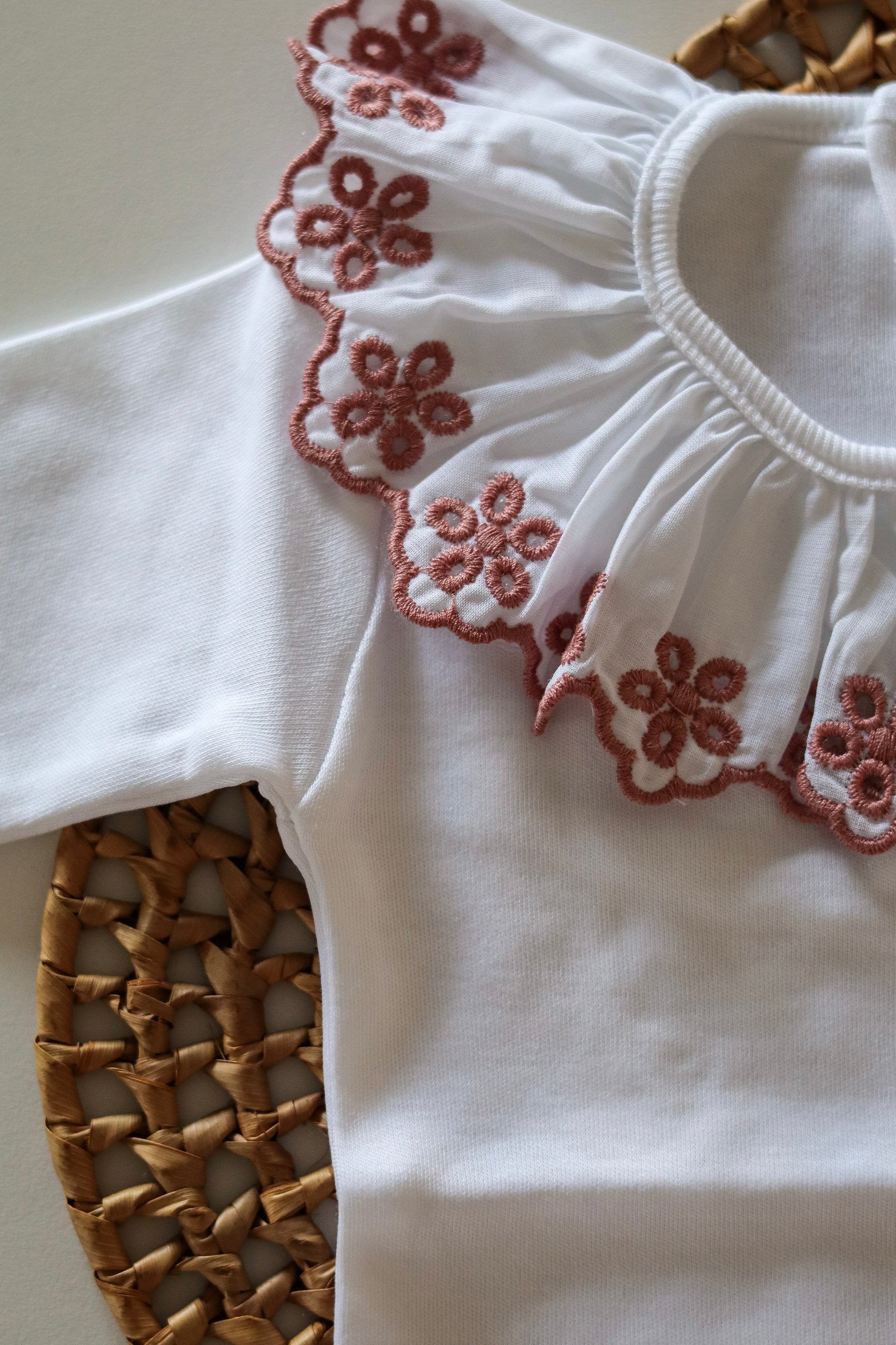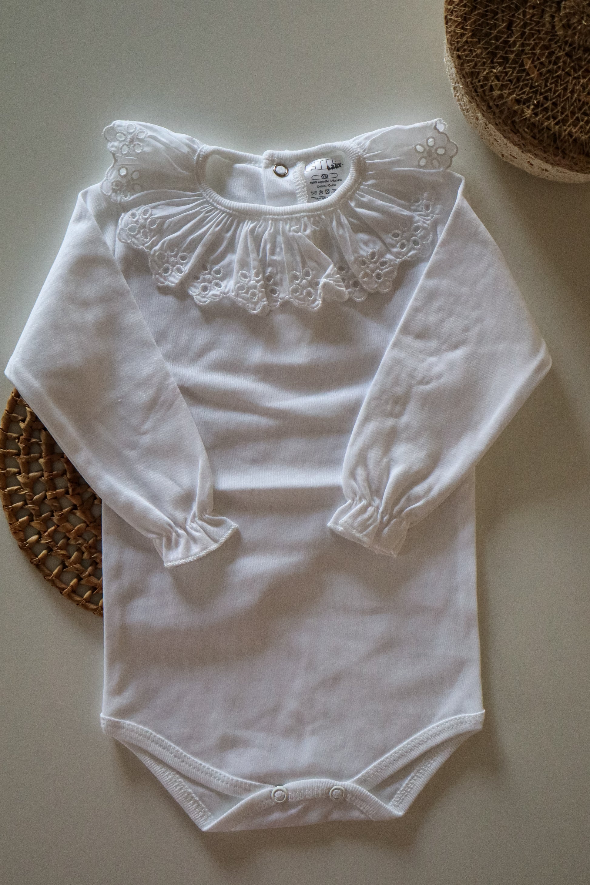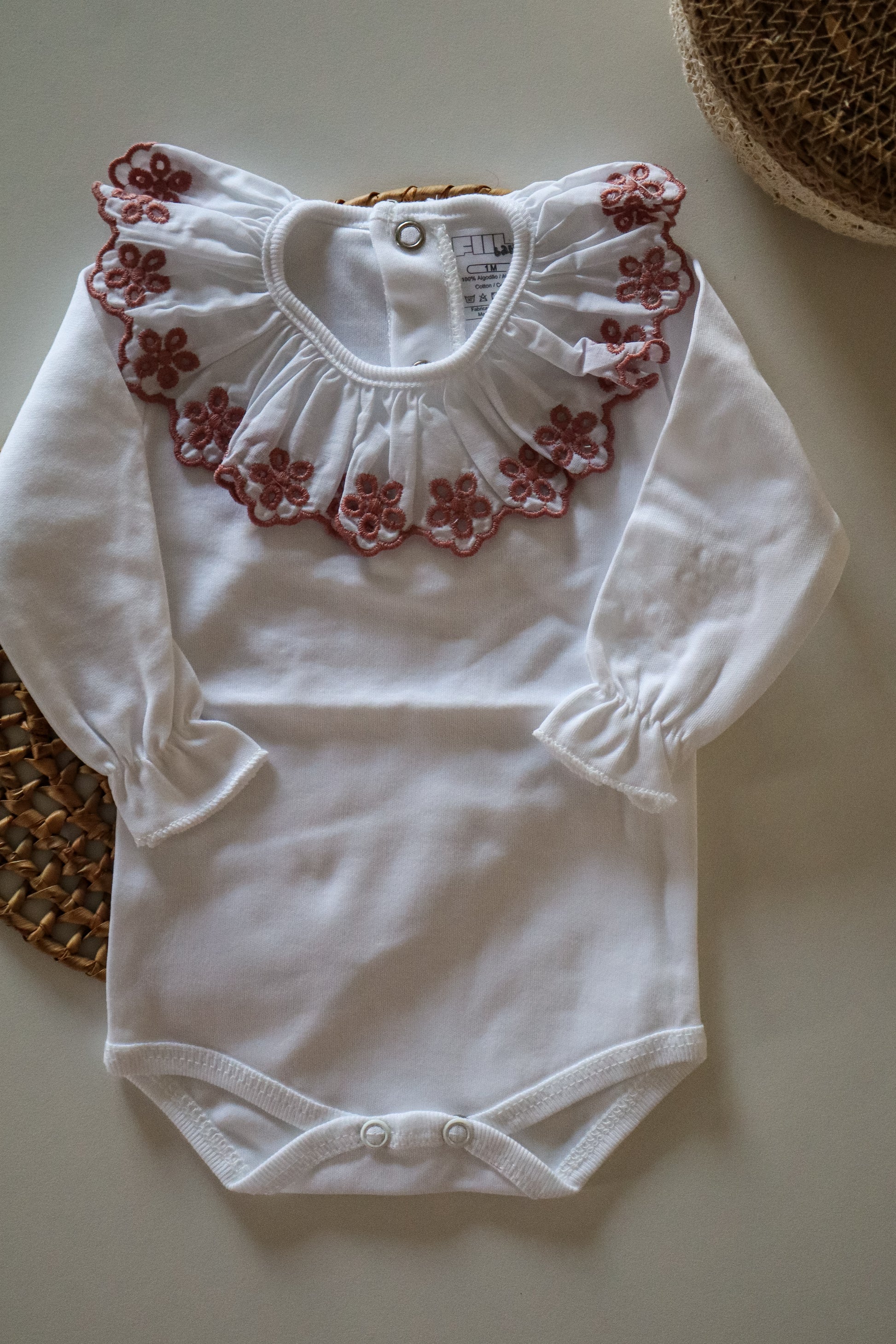 Inspirado nas cores suaves do outono, o body ramo reflete um equilíbrio sereno entre o toque suave do algodão e a beleza delicada da gola bordada.