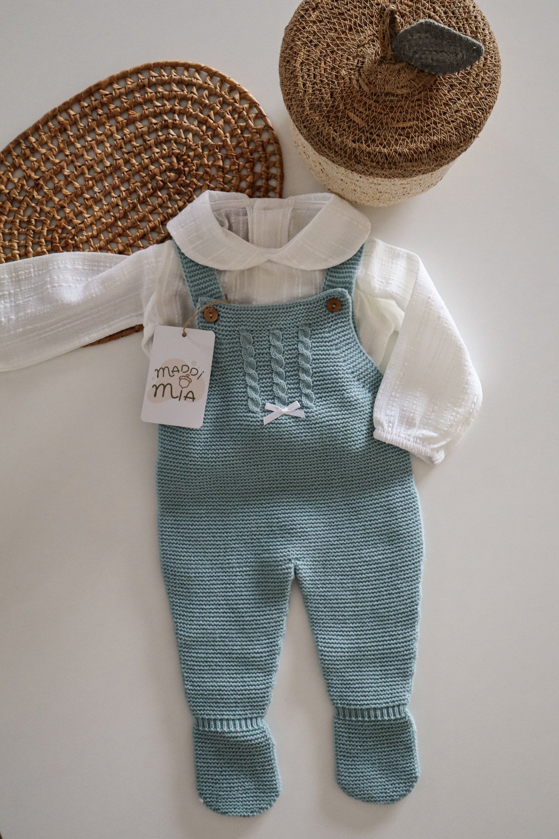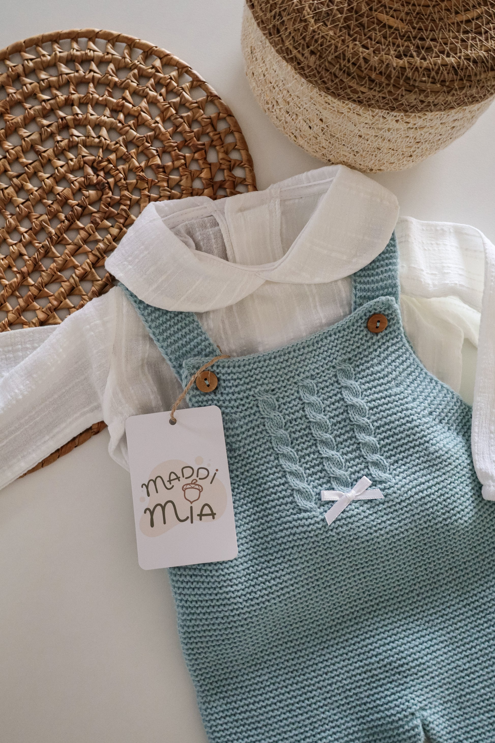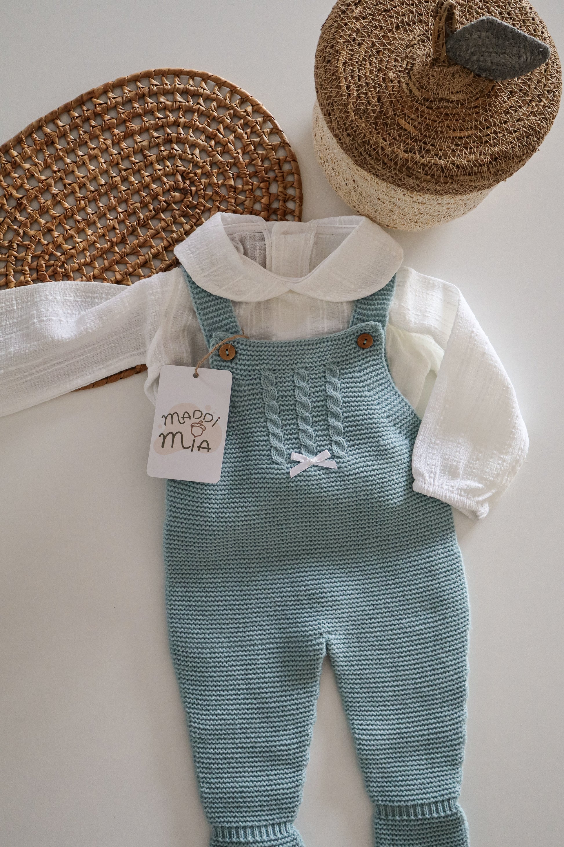 Inclui macacão de malha e acompanha com body branco.