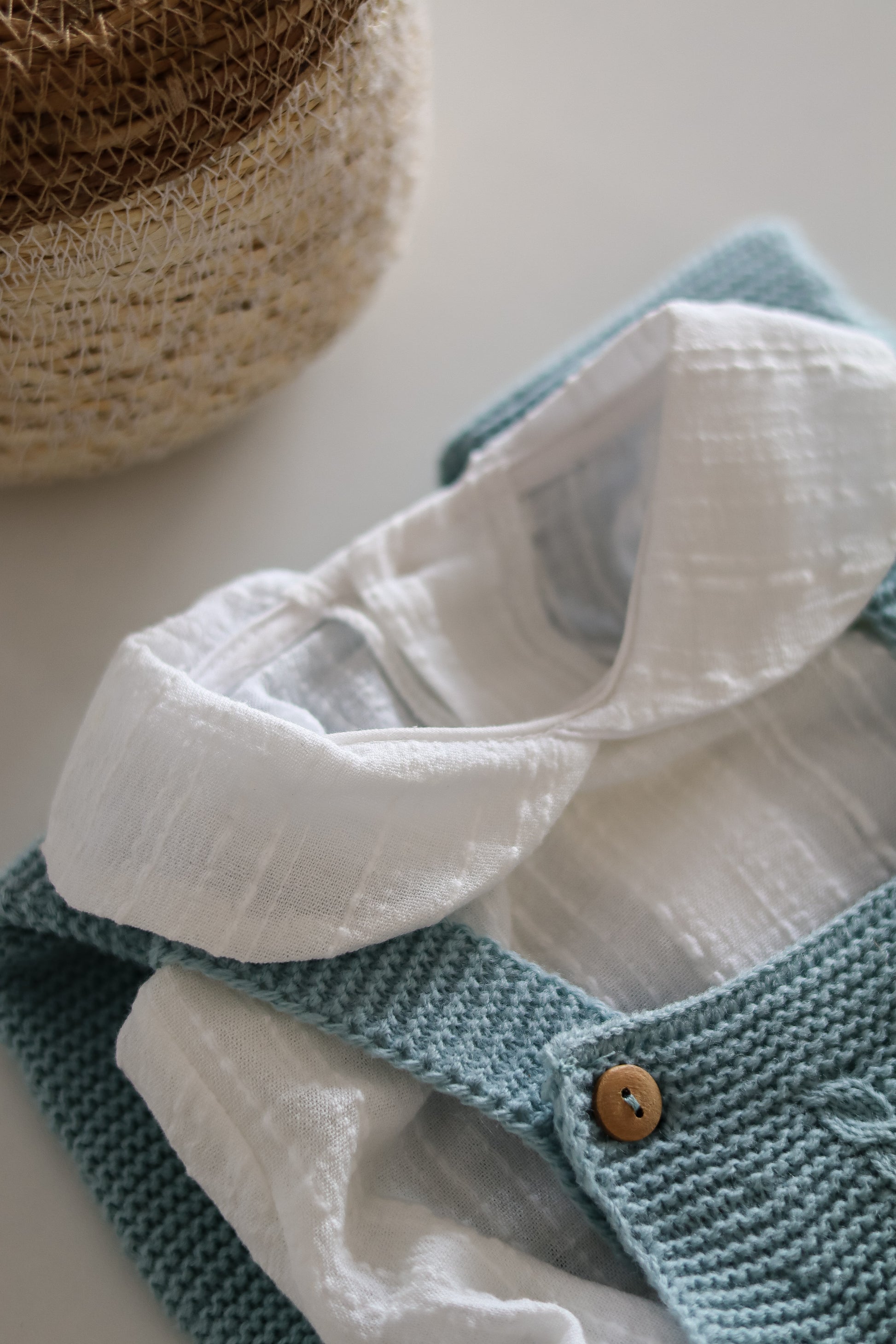Conjunto macacão luz, na cor azul, delicado e confortável, ideal para os primeiros meses do bebé.